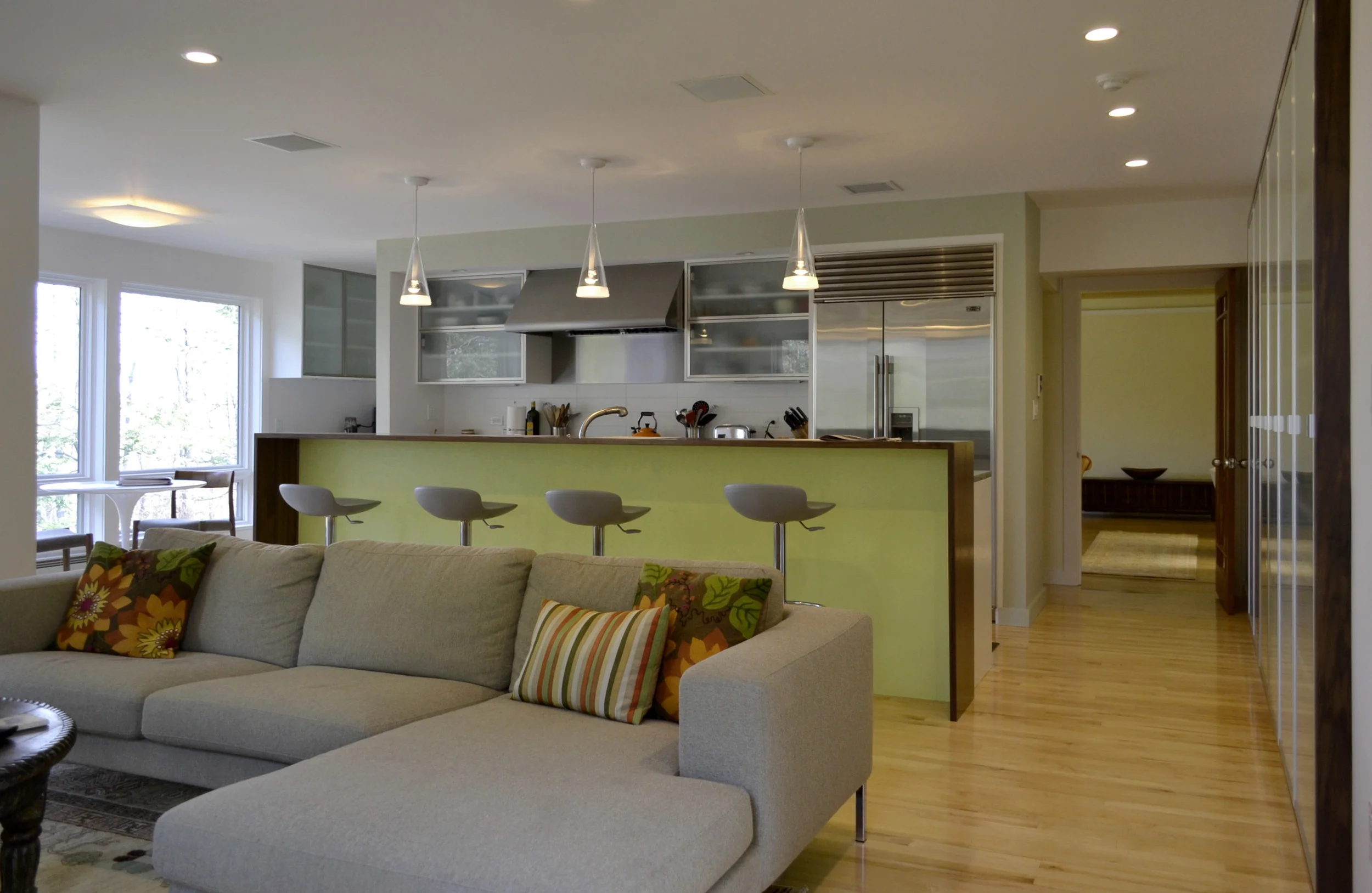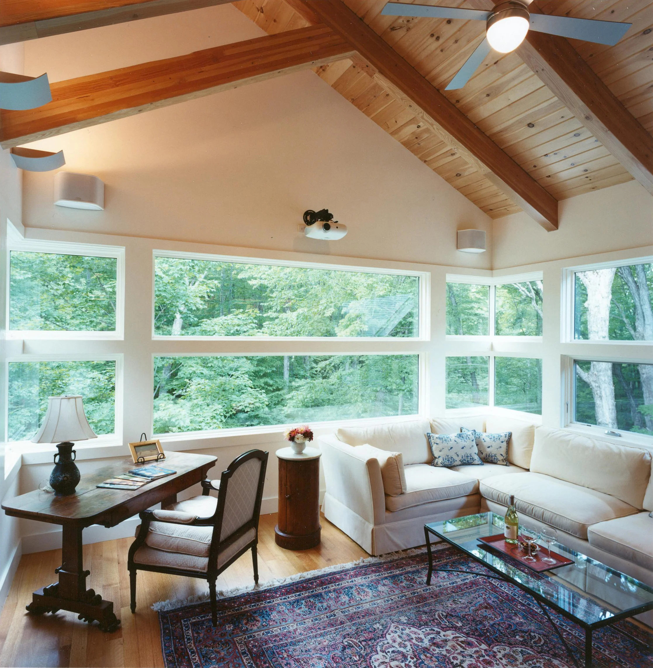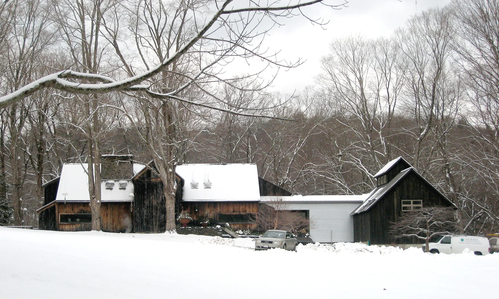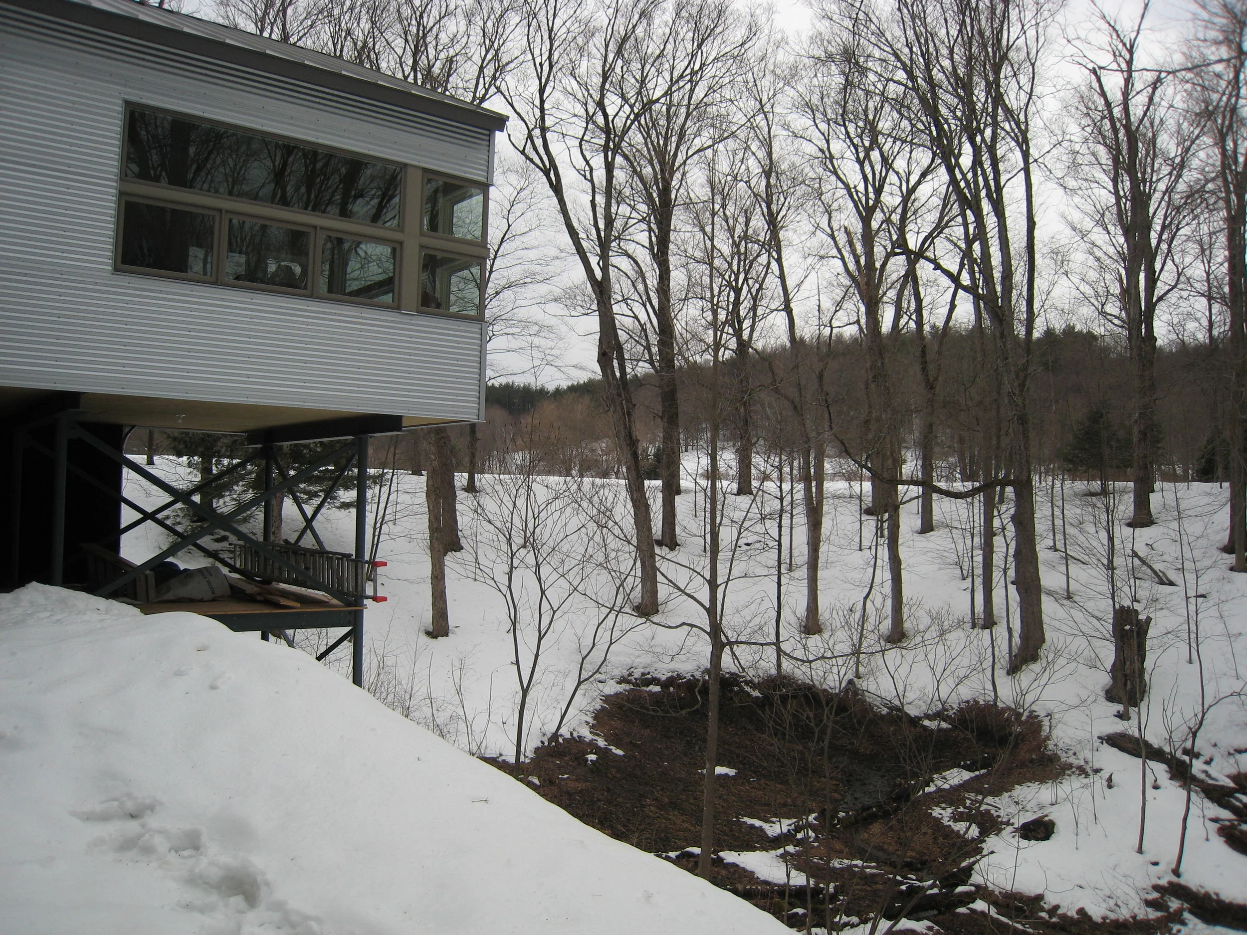 New construction on a Northampton wooded hillside. Single floor living with studio workspaces below.